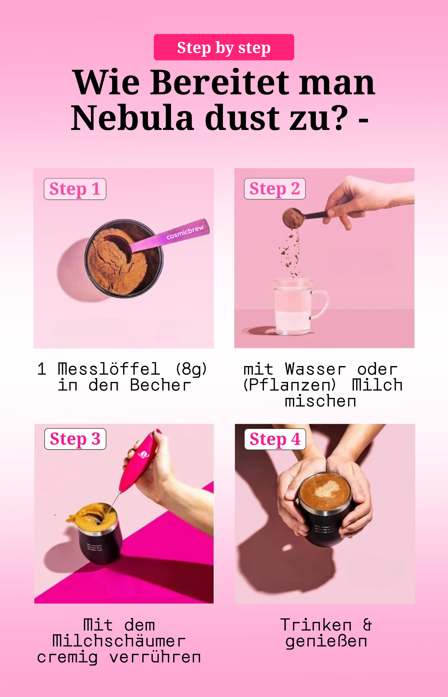 Genieße Nebula Dust pur mit Wasser oder (Pflanzen-)Milch – heiß oder kalt.