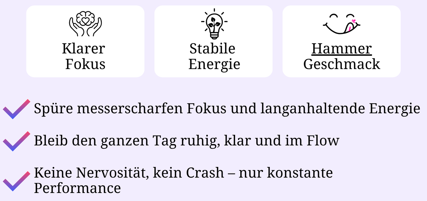 Energie & Fokus ohne Nervosität, natürlicher Geschmack statt Chemie, entwickelt von drei Menschen, die selbst genug vom Kaffee-Kater hatten.