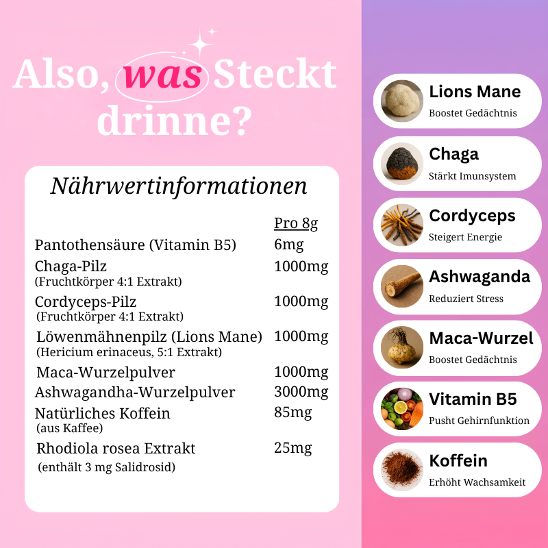 Entfalte dein volles Potenzial mit unserer kraftvollen Mischung aus Pilzen und Adaptogenen – sie schmeckt großartig, fühlt sich gut an und bringt dich auf dein nächstes Level.